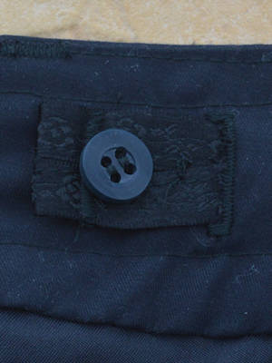 Internal drawstring button tab Waistband has a channel to run an elastic drawstring on the inside. The drawstring ends near the front beltloop so the front waistband will remain flat. The end of the drawstring has buttonholes, which hook on to a small button inside the waistband. This allows the length to be adjusted without having the bulk of the conventional drawstring bow knot. It can be adjusted easily with one hand. I tried to make the tabs of the drawstring from self fabric but it was too narrow to sew the buttonholes onto. Instead, I used two strips of narrow ribbon, bar-tacked together at regular intervals to form button holes.