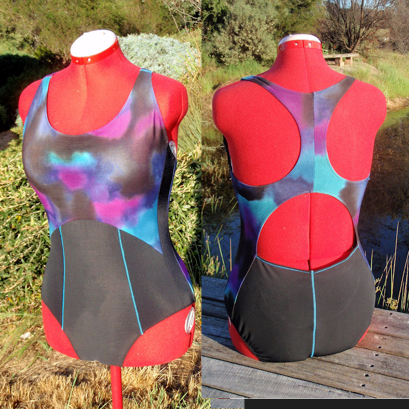 Originally I had planned to make another version on Merckwaerdigh BAD24 that I made earlier in the year – I’ve almost worn it to death. But the panels didn’t work out for it. Even just using the centre front with colour and the rest plain didn’t work with the print. Plus I was a bit nervous about the bright red and orange patches at the crotch. Option 2 was the strapless swimsuit, similar to the second example. I had trialled the bra in my previous post but without the right underwire, that pattern was on hold. Eventually, I decided to use the pattern that I’d made up in 2012 as a knock-off of a Danskin swimsuit and make it more of a training swimsut.