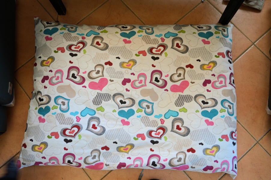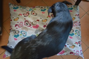 Last but not least, is a new cover for the dog’s bean bag. Just a plain rectangle, with a zipper sewn in to make a tube, then the ends sewn together. I think she likes it. When I went to take a photo of the finished back, she decided it was time for a tummy-tickle 🙂
