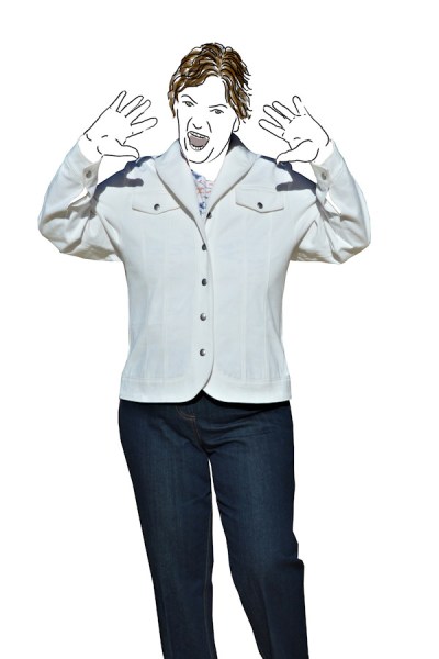 The jacket is Lekala 5312 – kind a cross between a blazer and a jean jacket.  The pattern goes together and fits well but the sleeves could be improved.  The are just a normal one-piece sleeve, where I would have preferred the seam offset so it is visible from the back.  Apologies for the “scary face” on the second photo.  I was being a bit silly, but I do like the look of the shorter length when I raise my arms.  Having the jacket finish above my hip-line is a bit more flattering when the jacket is done up.