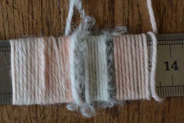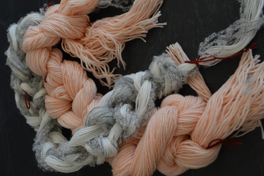 I’ve been told that I play to ‘safe’ with my colours, so I’m not going to use the charcoal yarn. Instead I’ve ombre dyed a skein of wool in a light peach – just subtle variegation. That’s my orange and variegated weft sorted out. Using the same structure I had before for the lace. Just thick/thin to do. I’m going to use a light grey mohair bouclé yarn to outline the stripe sections. Ok, it’s a light charcoal ( not as adventurous after all) but it’s just 8 warp threads – and I think the colours look good together.