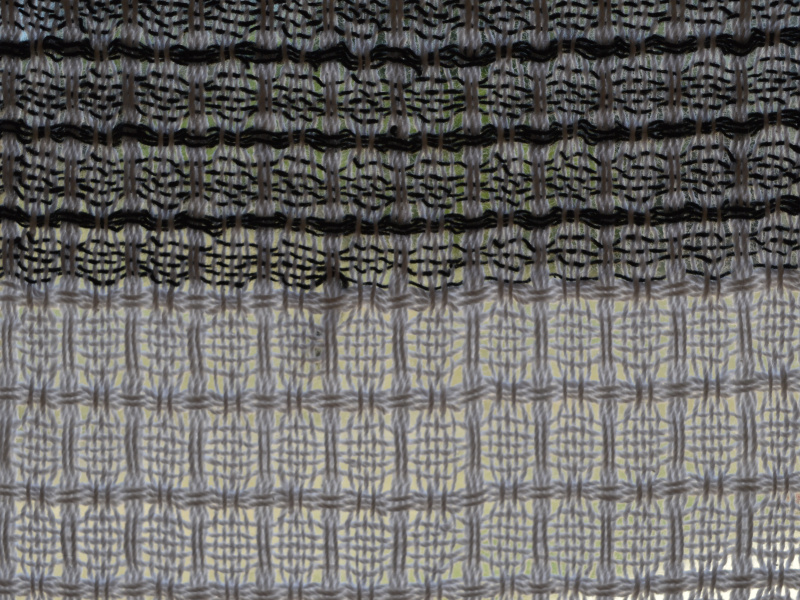 The other weave I was interested in was the lattice weave. It was very hard to see the pattern on the loom and you can just pick the diagonal ridges looking across the cloth. I had a hunch that there was a problem with the treadling, and sure enough, I ‘invented’ a weave which is part lattice and part cable 🙂 I think the last block in the treadling is an end block rather than part of the repeat. But I’ll plug it into the weaving program to make sure I get it right.