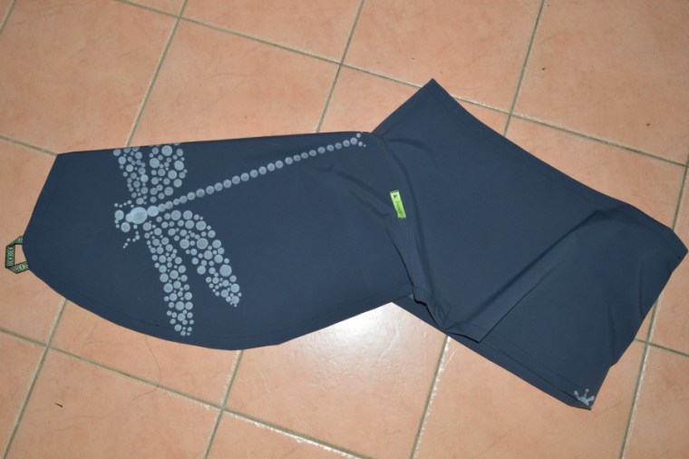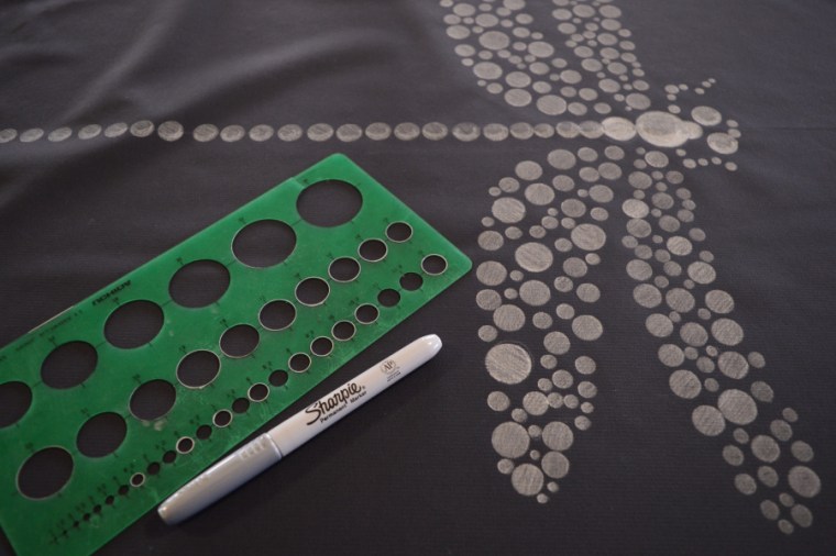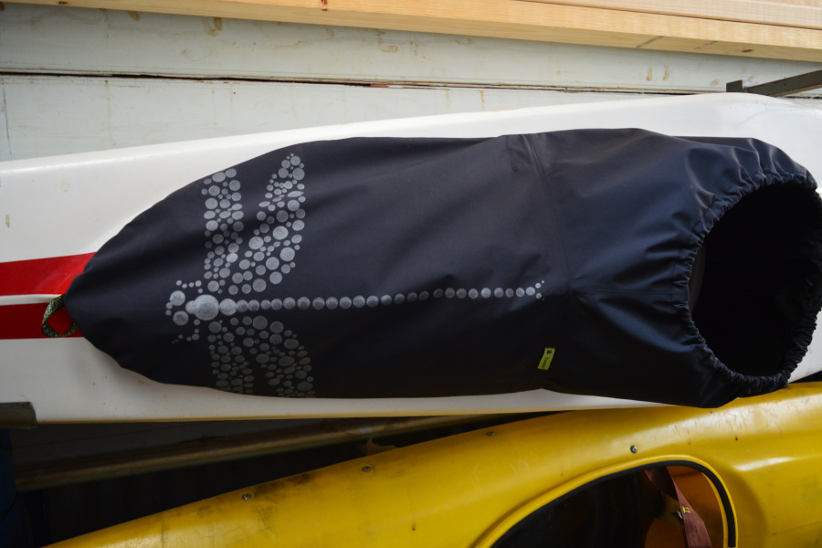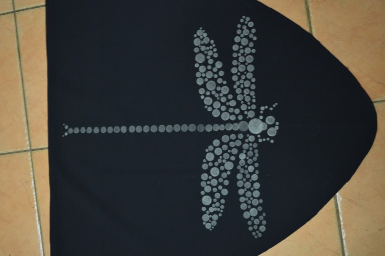 When I was doing some snoop shopping for spray skirts, I came across a deck for a white water kayak that had an octopus print on it.  It looked really cool!  So I gave DH the choice of about 10 different designs that I thought would look good on the deck section and told him to take his pick.  He chose a dragonfly and wanted glow in the dark paint, but had to settle for silver instead.  It was possible but I would have needed to make a stencil to use the glow spray paint – lots of little circles – ugggh.  Much easier to use a marker with a template.
