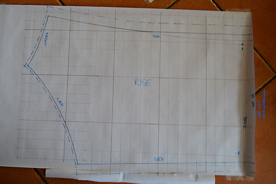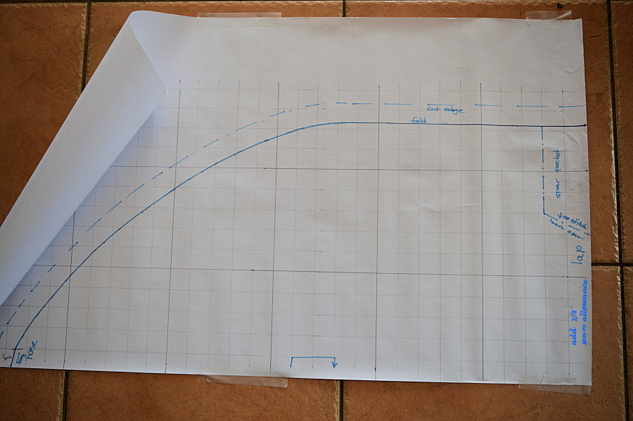 This is the pattern, with each square being 1″.  There is a 1″ seam allowance for the casing and 1/4″ on the internal seams.  The original skirt had reinforcing pieces on each side of the lap seam.  I’ve changed this to a pocket that will hold a flexible spar.  This should help to hold the lap seam up and shed water better.