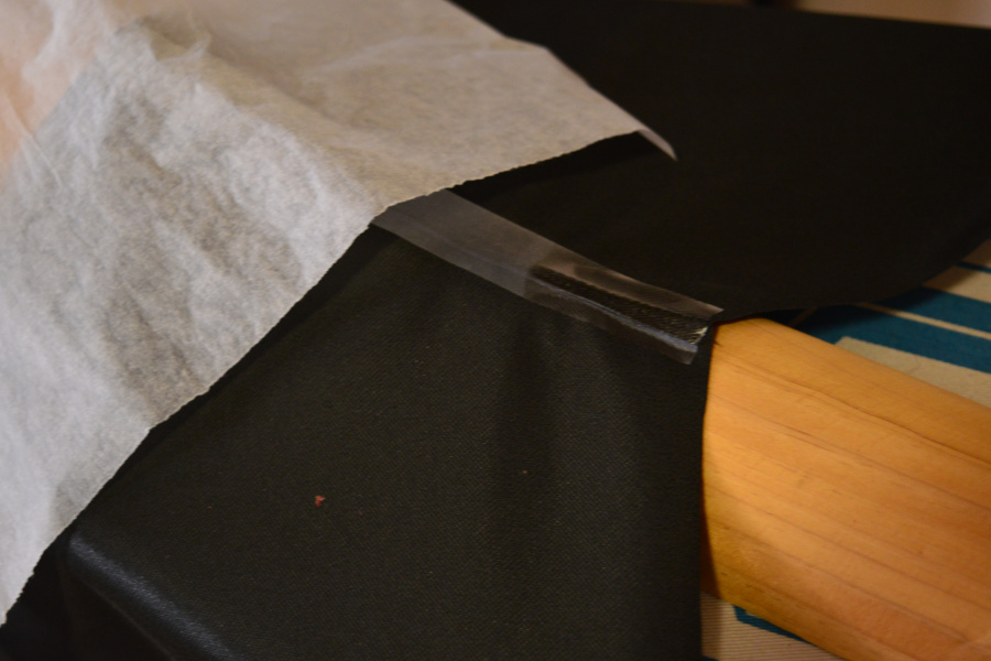 2. Stitch the front seam of the tower ( 3 – 3.5mm stitch length).  Topstitch and seam seal.  When I apply the tape, I use a D shaped handrail offcut so the fabric drapes over it and the iron only comes into contact with a small section near the seam.  I use a wool heat setting with a piece of baking paper between the iron and the tape to protect the fabric backing.  You can just see enough through the paper to see when the tape fuses ( as in the right of the photo below).  I find it easier to do  10cm sections at a time, making sure it has fused well and cooled a little before moving to the next section.