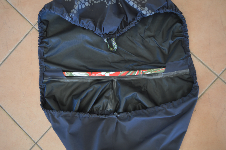7.  For the spar, we’ve used a piece of orange tongue plastic ( the stuff that is used for the tongue in particle board sheets) as this is what DH had in the shed.  Alternatives could be nylon kite spars, aluminium strip, anything that has a firm flex.  The edges were rounded so the corners won’t wear a hole though the fabric.  The plastic was rough in spots so I made and a tube of nylon lycra to cover it and protect the Goretex.