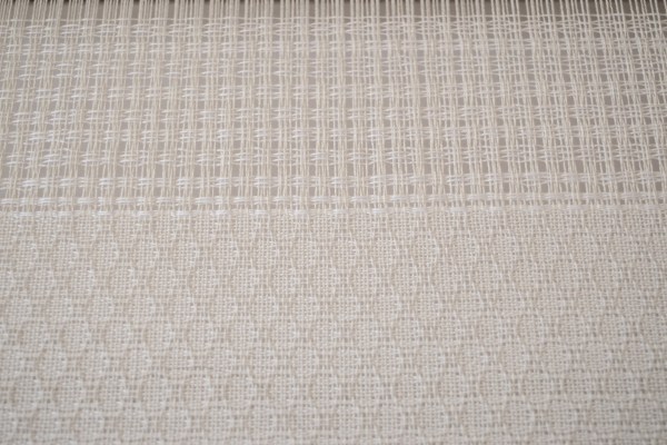 I’ve woven 1m of the lattice pattern and now working through 1m of the huck lace (grid like) pattern. Then I’ll weave another metre of the lattice pattern. For the huck lace, I’ve changed the treadling back to the original setup as it makes more sense for that treadling pattern. The threads are already starting to shift to form the grid pattern. It will shift more after it is washed and the lattice pattern will have more of a diamond look rather than the ovals it has at the moment.