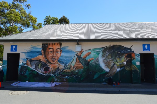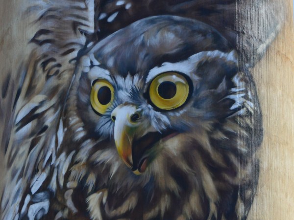 Over the long weekend, we went to have a look at the Wall to Wall Festival in Benalla. There are a number of street artists painting mural in different places around the town so it is fun to walk around the different sites and see the artists at work. One of the artists, DVate, paints threatened species. He’s previously done a Squirrel Glider and did a Regent Honeyeater last year for the festival. (ETA I just realised that the Kelpie was one of his artworks as well) This year, he was out at Goorambat painting a huge Barking Owl on the side of a silo. It was awesome to watch him work! I’m keen to go back out there and see the finished Owl.