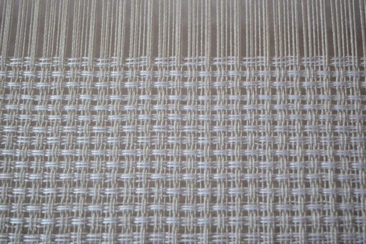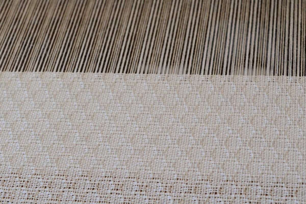 I’ve woven 1m of the lattice pattern and now working through 1m of the huck lace (grid like) pattern. Then I’ll weave another metre of the lattice pattern. For the huck lace, I’ve changed the treadling back to the original setup as it makes more sense for that treadling pattern. The threads are already starting to shift to form the grid pattern. It will shift more after it is washed and the lattice pattern will have more of a diamond look rather than the ovals it has at the moment.