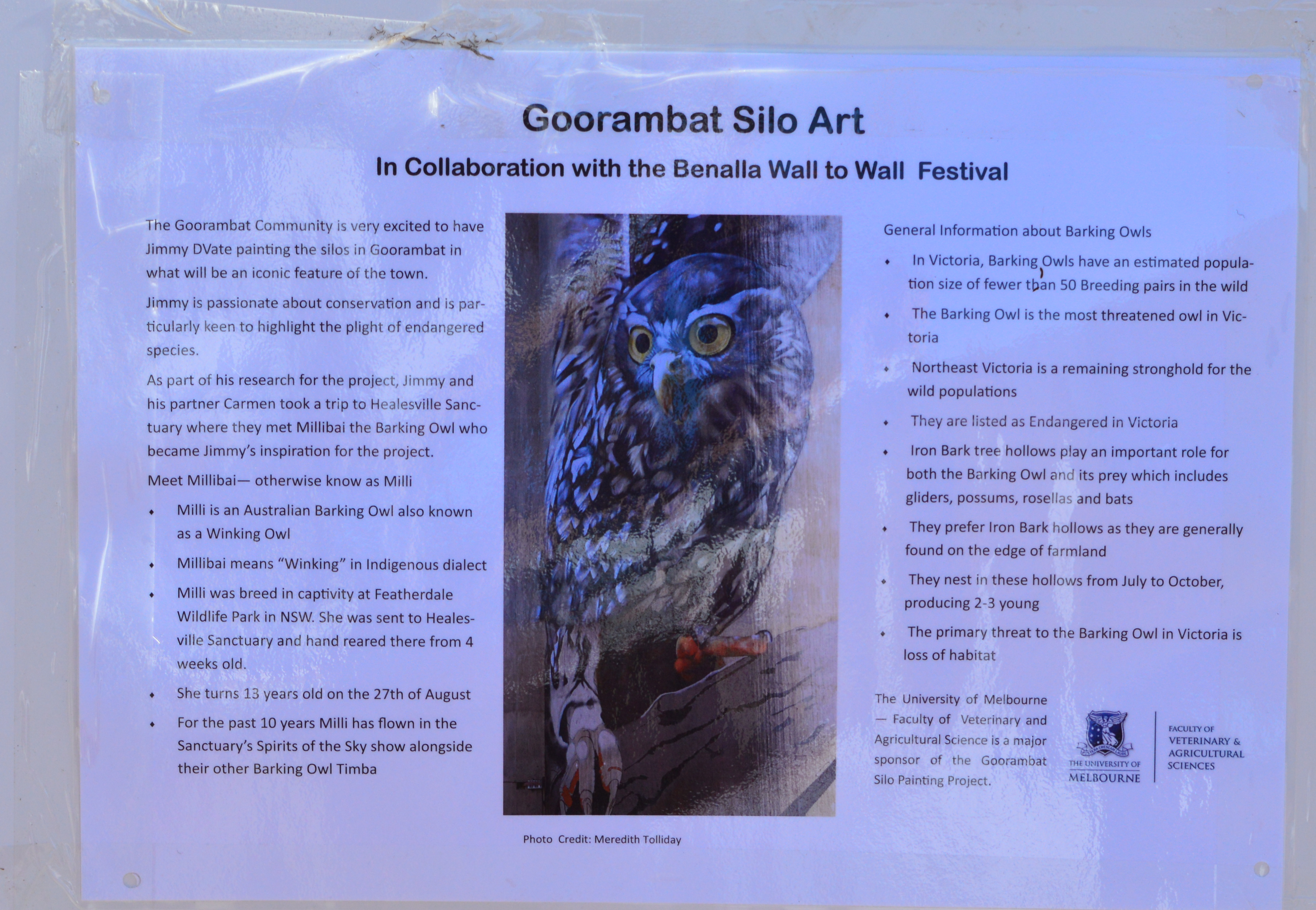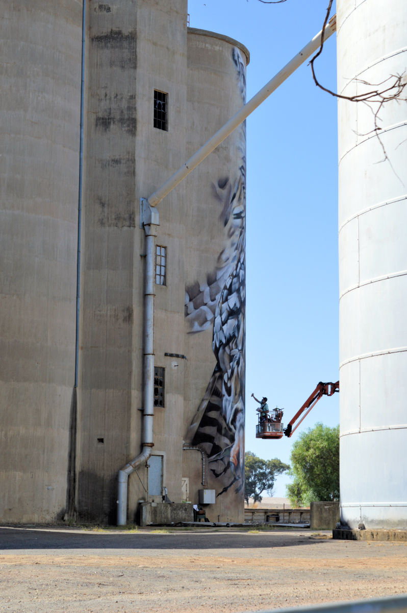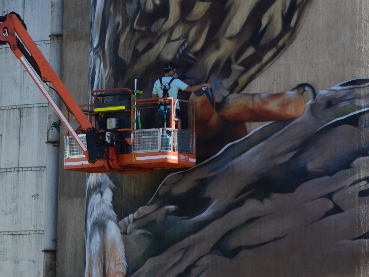Over the long weekend, we went to have a look at the Wall to Wall Festival in Benalla. There are a number of street artists painting mural in different places around the town so it is fun to walk around the different sites and see the artists at work. One of the artists, DVate, paints threatened species. He’s previously done a Squirrel Glider and did a Regent Honeyeater last year for the festival. (ETA I just realised that the Kelpie was one of his artworks as well) This year, he was out at Goorambat painting a huge Barking Owl on the side of a silo. It was awesome to watch him work! I’m keen to go back out there and see the finished Owl.