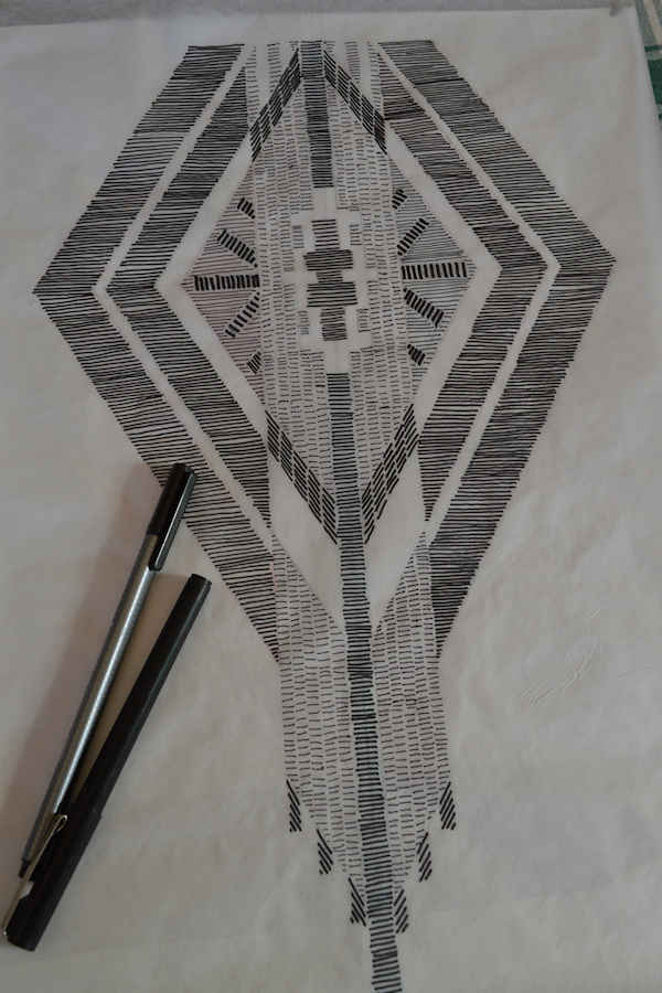 Then I put a sheet of tracing paper over the top and did the line work.   That bit took a while.  From there, I scanned it, and played around with some colour schemes.  Then mirrored the image ready for printing.