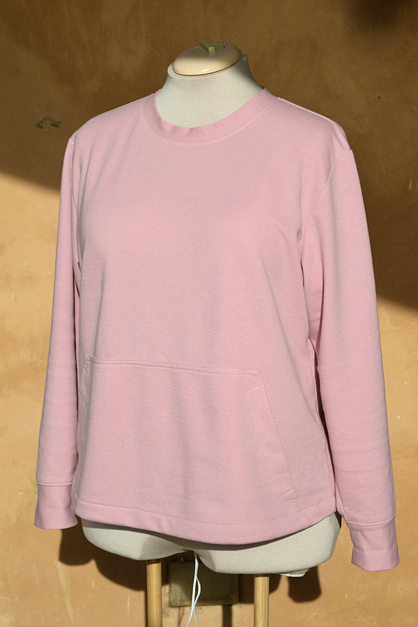 The finished sweatshirt is a little big, even though I went down a size from that which was recommended. That’s not such a big problem given that it’s a sweatshirt – sloppy is OK. I left of the band at the hem and did a simple turned hem to reduce the length. The sleeves were a tad long and wide, so I trimmed of about 5cm in length and tapered the seam in by 1cm, on each side, toward the cuff. The cuff has also been narrowed (lengthwise) by 2cm. Given the adjustments, I could have it three sizes smaller than the recommended size.