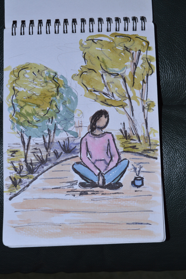Last weekend, a friend took me for a short walk. I didn’t get far, perhaps a half hour of walking, but when we stopped,she pulled out sketch pads and charcoals. We sat there drawing and chatting for a while before heading back to the car. It was really great fun and I realised how much I missed drawing. She is a really great artist! I tend to sketch like I’m doing an engineering drawing ( I wonder why), so I’ve been challenged to do quick sketches – just 5 or 10 mins max. My plan is to keep a sketchbook and pens in my bag. If my foot needs a rest, or I’m taking a break at work, I can spend a little time doodling. Last night I had the bright(??) idea of doing a sketch for each of my sewing projects – a landscape or urban scene with a random person it it wearing what I just made. I’m hopeless at drawing people, hence the random person, and no attempt at a selfie. Just the vague notion of a person in the sketch is enough at the moment. With practice, I hope get better at it. Consider it like a ‘wearing suggestion’ in the same vein as a ‘serving suggestion’ on a food packet.