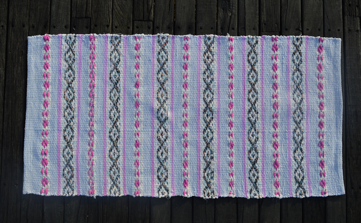 Both are flannelette, so the rug has a slightly suede feel. The blue sheet had a subtle cloud pattern which gave a nice watercolour effect in the weave. The other had coloured stripes on a white background. I cut this one on the cross-grain to get the colours changing along the length of the strip. I really like the effect it had in the weave as it reminded me of a heap of coloured mini-marshmallows. Which is why I’m calling it the marshmallow rug.