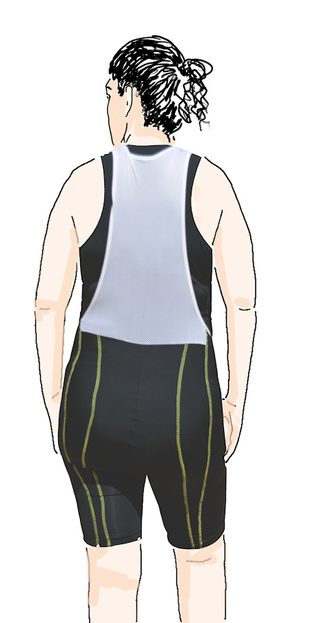 When I first made this pattern, I noted that the elastic guides were too short for the armholes and neckline. I didn’t use the guide this time, just using a continuous piece of elastic and putting a slight pull on it as I stitched it in (similar to doing bra elastics). The edges are finished with clear swimwear elastic, so I can also wear this over togs or with boardshorts. For that reason, I didn’t include back pockets like I usually would do for a cycling jersey. The side panels on this pattern would make it fairly easy to add back pockets.