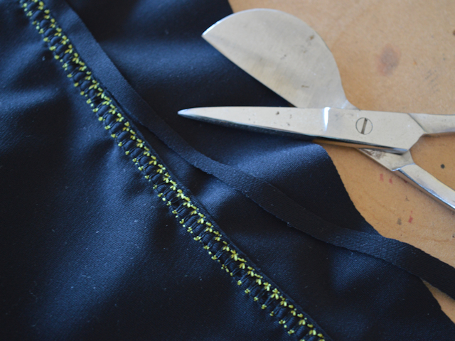 For the shorts, I tweaked the pattern slightly to add a bit more ‘sitting curve’ to the leg shape. It makes them a slightly more baggy under the bum when I’m standing, but the extra room is better on the bike. With this pair, I played round with seam finishes to get a decorative flatlock look using just the sewing machine. I tried a few different stitches, looking for something that would show the contrast thread colour well, but still keep both the stretch and recovery of the fabric.