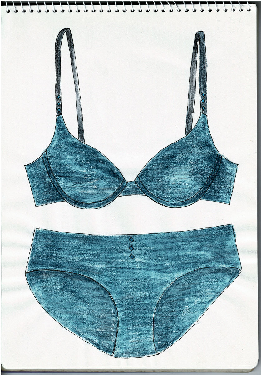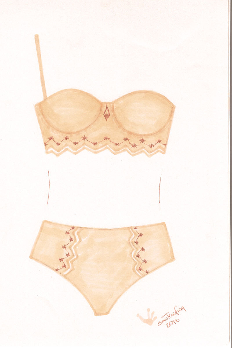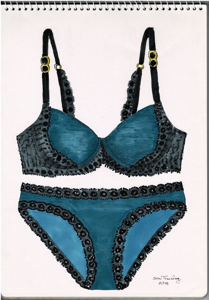 Another fabric which doesn’t photograph well. Currently tossing up between a very plain t-shirt bra style set and one with lace bits. I’ve got some nice strapping and FOE in navy with a silver accents that works well with this fabric, so I may go with option 2 over option 3.