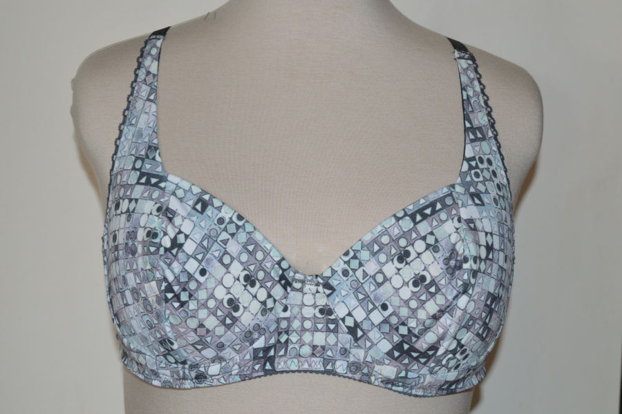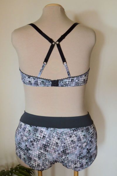 The fabric is a poly print that I picked up at my favourite fabric shop. I’m not sure that the colours show up well. The main colours are a minty green with charcoal and black, with shades of a dusty purple. The inside is fully lined with black powermesh for support. Elastics are a combination of black and hand-dyed charcoal.