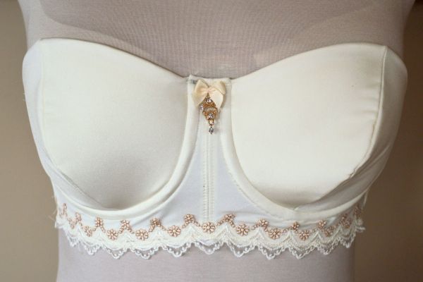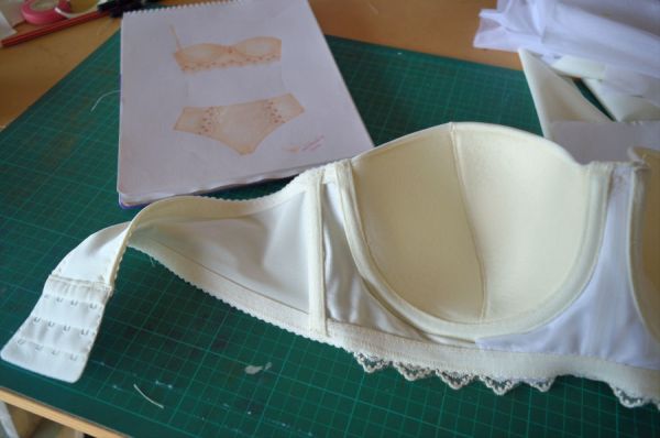 From my initial sketch, I was planning to increase the depth of the band by about 5cm to better frame the gold detail of the lace. I forgot to order the hook and eye tape and had to make do with a 4-hook high closure. The band has been lengthened by 3cm at the front and then tapered from the side to the closure.