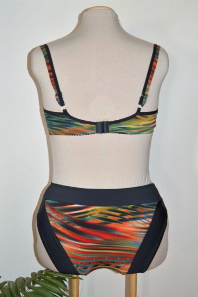 The bottoms have a similar style to the one-piece swimsuit (BAD24) that I made recently, with the front side panels wrapping around the form the back waistband. It isn’t the most straight-forward of designs to sew, especially applying the elastic. I’ve used FOE on the top edge of the from panel, and a narrow piped elastic on the other edges. The print fabric is lined with swimwear lining as it is fairly thin. The black is a firm swim lycra.