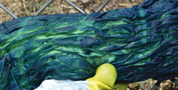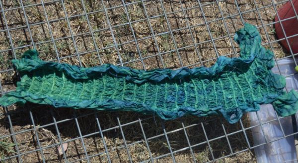 Each time, I’m holding my breath that it will all work out well in the end. It’s now had its 6th soak. The colour is looking more even among the folds and all the knots have held. At this point, I have a nagging doubt that I’ve soaked it too long and there will be no resist and all the stitching and gathering will be for nothing.