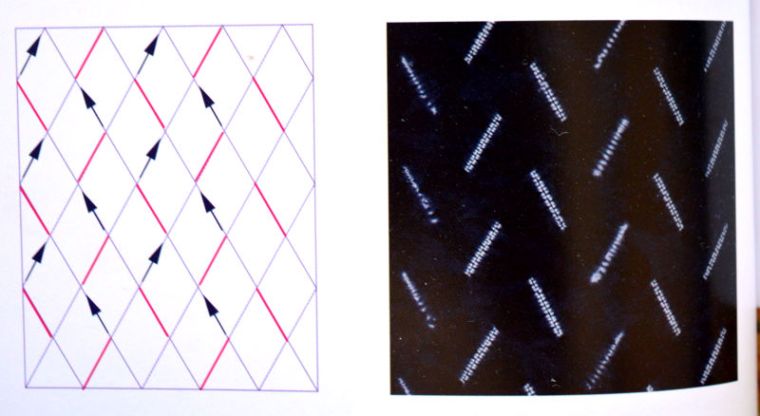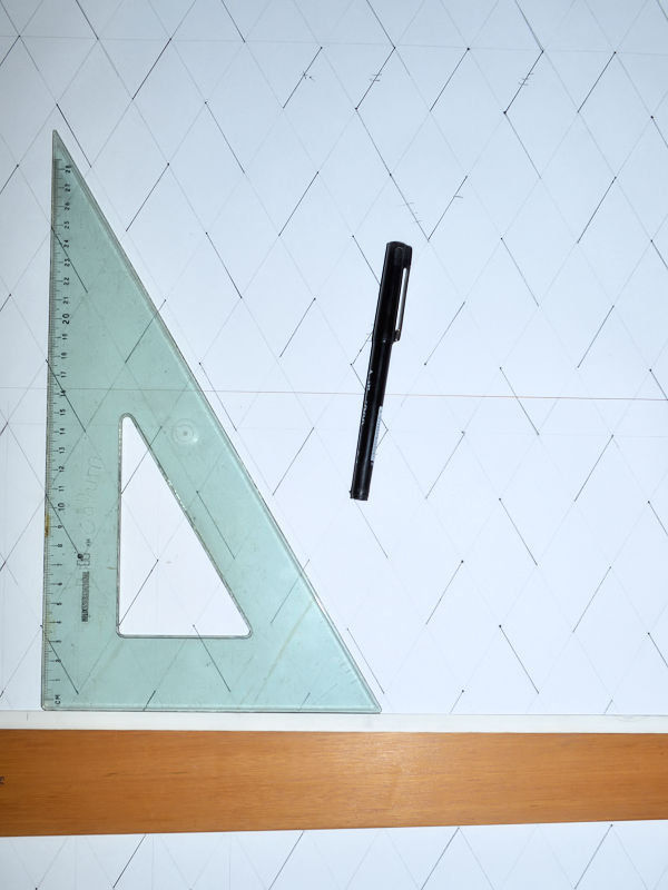 The fabric is a slub cotton that I had in my stash. A little too sheer in white, but will be fine in a darker colour. It is 2m long by 120cm wide. Enough to make a short sleeve blouse. First up, was making up a grid with a 4cm spacing and creating the diagonal lines at 60 degree angle.