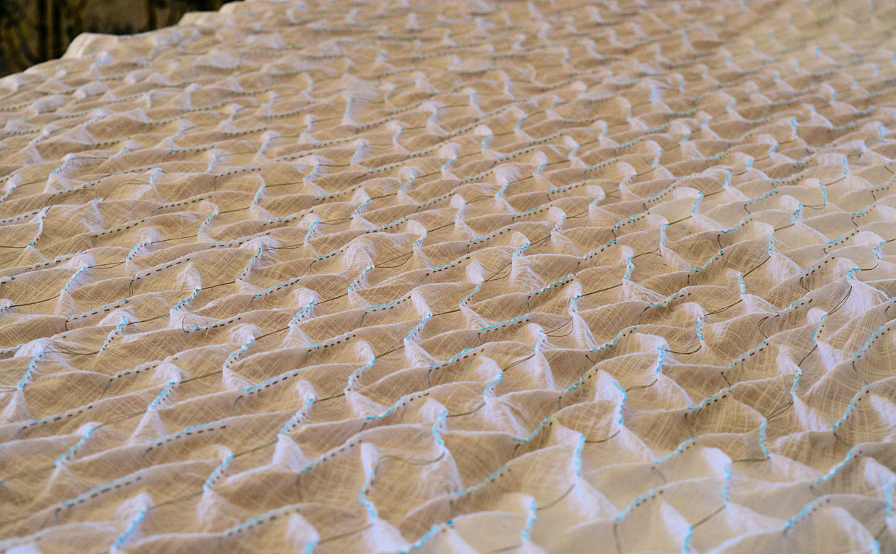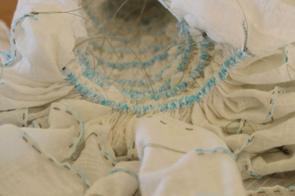 Next came the gathering and knotting. 2m of fabric gathered up to just 12cm! Starting at one end and pulling each column up in term, the fabric first started to look like a shirred bodice with flared skirt, then a mushroom with a frilly cap, then a coral polyp as the last columns were gathered up. It was quite hard on the hands, and I ended up using a pencil to wrap the thread around to get enough tension. Each line was tied off with a double knot. A piece of string placed between the fabric and knot to give it something to bite onto.