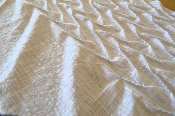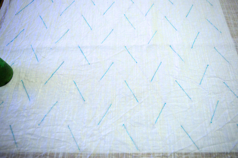The style I’ve chosen is ori-nui stitching. It is done with running stitches on a folded edge, which when gathered and dyed, produces two parallel lines. I’m going to an all-over pattern, hopefully, that will look like this.