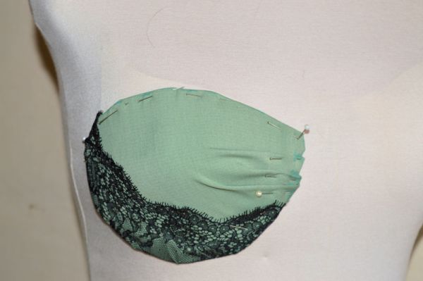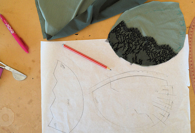 Accurate seam allowances were added a long the neckline edge, and a wider ‘just in case’ seam allowance was added to the wireline. When sewing the cover, the lycra and lace were treated as one.