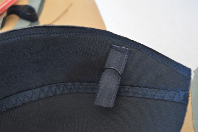 The top edge of the cup also has a single layer tricot tape stitched in to stop it stretching out. I remembered to sew in the base of the strap attachment before doing the cover. I have a habit of missing this step! The top edge of the strap is caught in the cover seam so there is no stitching on the outside of the cup.