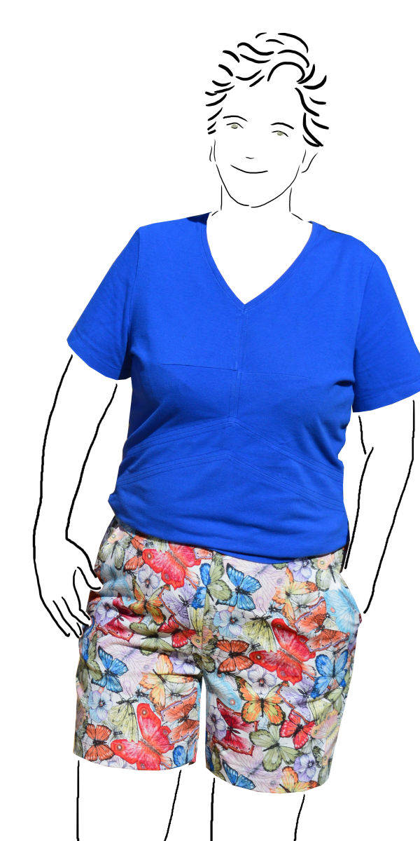 What is new is the olive T and the butterfly print shorts. The first olive T that I made (Style Arc Courtney) was a real flop, but I found a nice slub cotton that I’ve made using a Lekala pattern. This pattern was a freebie when it was released as a beta pattern a while back, but has since disappeared from the site. But it is a great pattern. The neckband is applied before the lower front is sewn on, so it makes the V neck very simple to put together. I’ve added the pocket flap for something different.