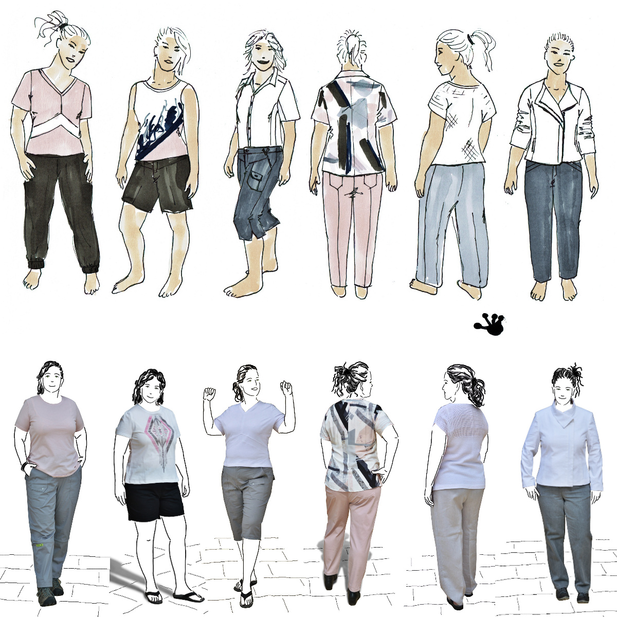 - Preferably solid colours. Prints need to be able to be worn with different colour pants, (or black and blue) to be useful