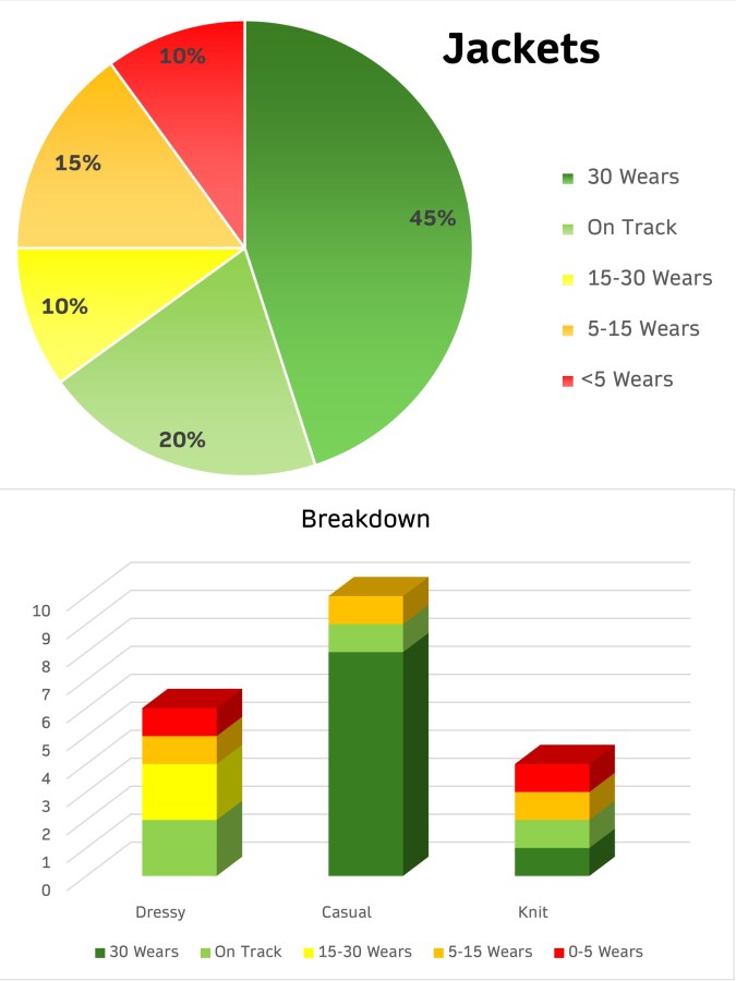 * On-Track – since I expect to get around 10 years wear from my jackets, those newer items which are getting around 3 wears a year would be considered as on-track. Those worn less often appear in separate columns.