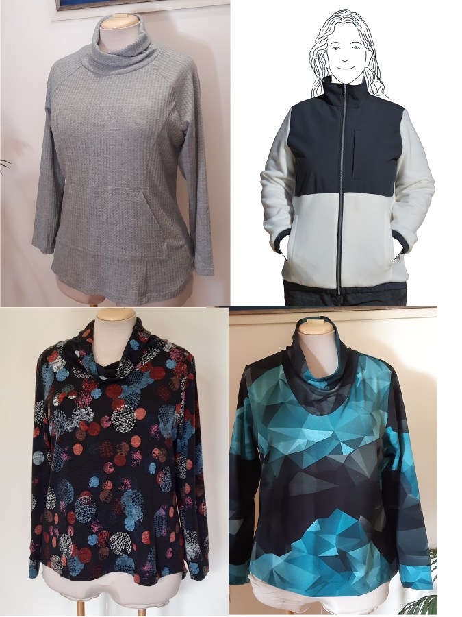 These are favourite jacket patterns – a classic blazer, classic jean jacket and more elevated jean jacket that works well in linen and a parka. I’ve used Lekala and Knipmode patterns for these, as I’ve already done the hard yards fitting them. Most pattern companies have a version of these. The red knit jacket shown below is an example of how I’ve used a dressier pattern that has a lot more of a smart-casual look.