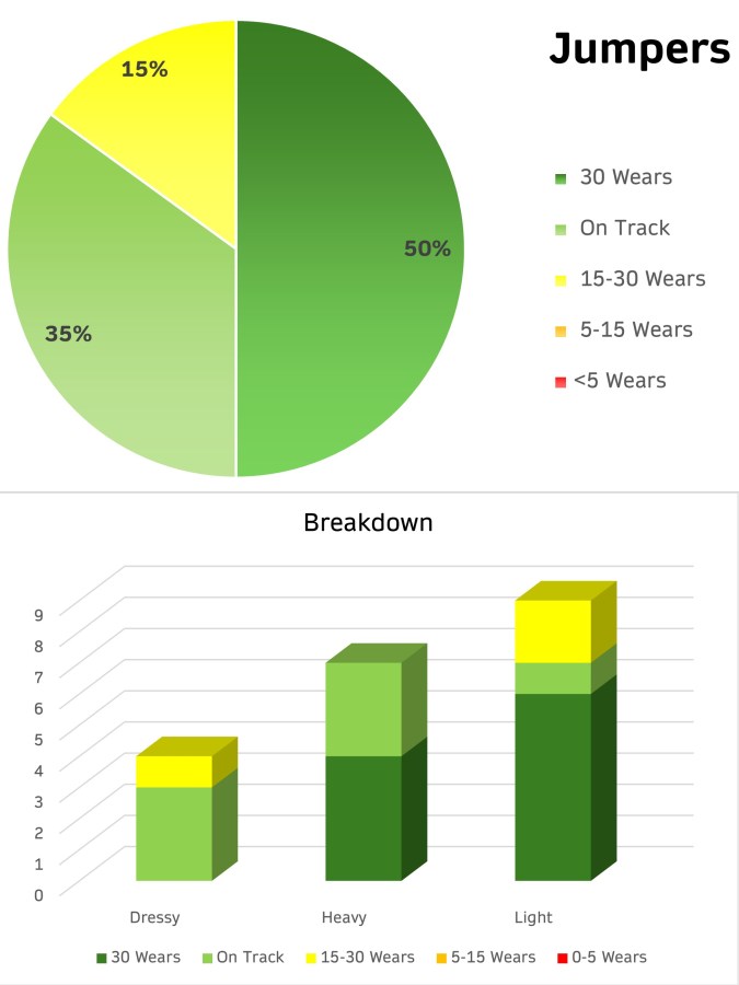 So here is the stats and breakdown for the jackets. My casual jackets get well worn. The couple that aren’t worn as often is because one having really stiff fabric and the other is a colour which is difficult to pair it with. The majority are plain colours which are easy to combine with other garments.